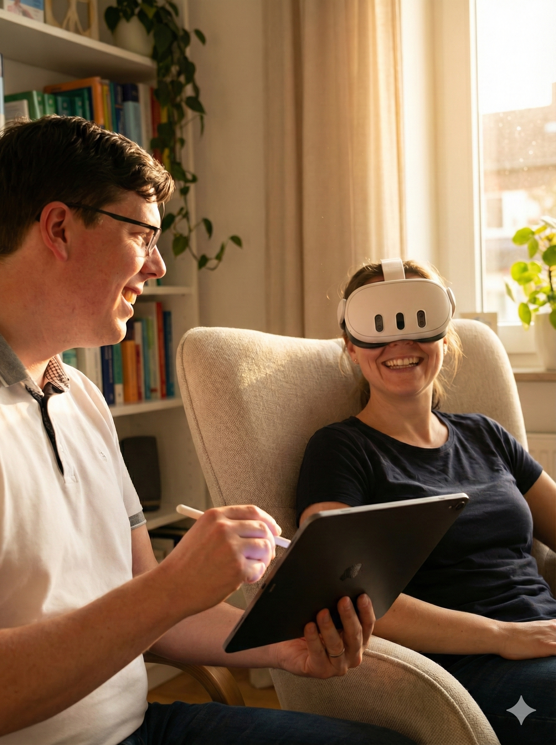 ✅ Mixed Reality (Keine Isolation): Dank modernster Kamerasysteme (Passthrough-Technologie) werden Sie nicht "eingesperrt". Wir können digitale therapeutische Elemente in den realen Praxisraum einblenden. Sie sehen mich als Therapeuten und Ihre Umgebung auf Wunsch jederzeit. Das schafft Sicherheit.